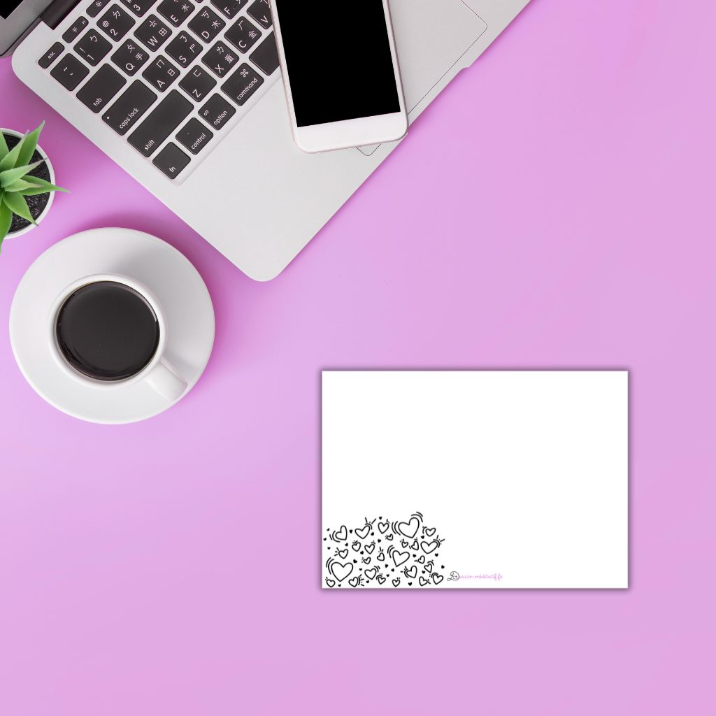 - 1 format carte postale (14,8 cm x 10 cm) « doodle cœurs »